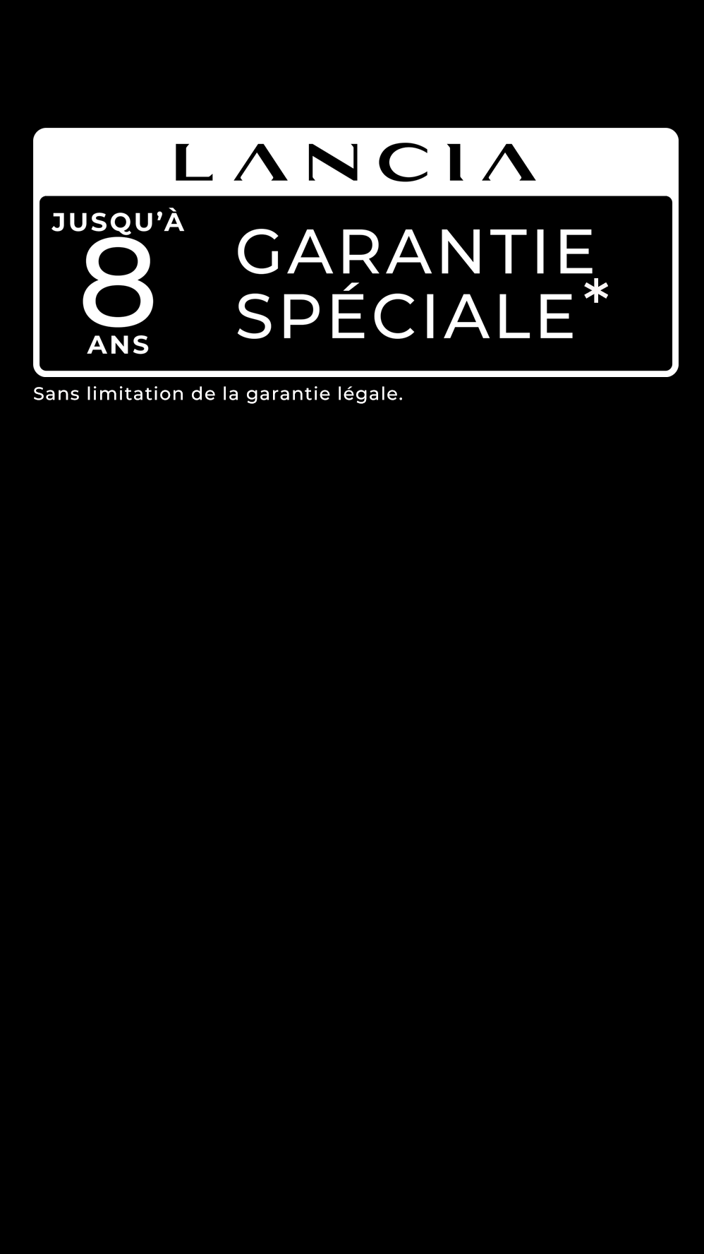 *Si vous décidez d'avoir sur votre nouvelle Lancia un entretien régulier effectué dans le réseau Lancia, vous bénéficierez gratuitement d'une garantie spéciale jusqu'au prochain intervalle d'entretien régulier, jusqu'à un maximum de 8 ans (en ce compris la garantie constructeur standard de 2 ans) ou 160 000 km jusqu’à un des deux termes atteints. Pour le contenu et les limitations, veuillez consulter le site Web Lancia. Offre valable pour l'achat d'une Lancia neuve entre le 1/01/2026 et le 28/02/2026 auprès du réseau officiel Lancia au grand-duché de Luxembourg et immatriculée au grand-duché de Luxembourg. Non échangeable pour un avantage équivalent.