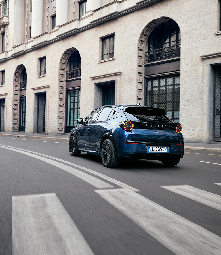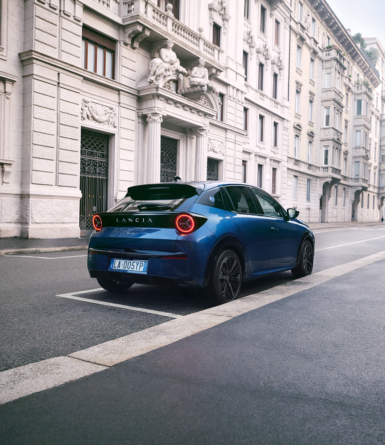 La face avant réinterprète la calandre historique de Lancia : le calice, avec trois faisceaux LED qui rendent la voiture électrique citadine reconnaissable de jour comme de nuit. À l'arrière, les phares à LED sont un hommage clair à la Lancia Stratos, une légende du rallye.